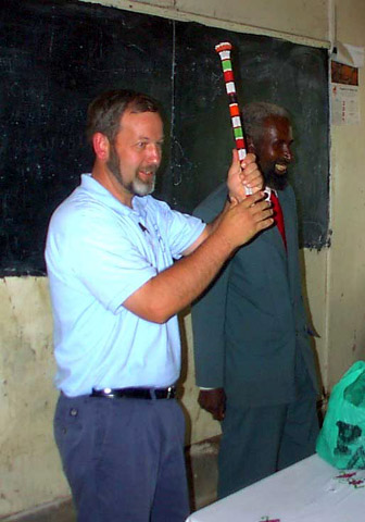 Pastor Madaus exercises his “rod of authority” (traditional Maasai “rungu”)